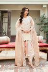 Dainty Tulip—A graceful tea-pink ensemble featuring a beautifully embellished organza jacket layered over a soft inner camisole. Paired with a sleek cotton silk shalwar and a viscous silk dupatta, it creates a refined and elegant silhouette.