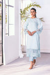 Enhance your wardrobe with our stunning Marine Mist jacquard shirt. Featuring a tonal embroidered neckline and organza borders on the sleeves and front daman, this luxurious top exudes elegance. Paired with comfortable cotton silk straight pants, it's the perfect addition to any formal or casual outfit.